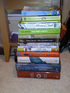 This group of books pretty much illustrates my random book tastes. At the bottom are some serious literary contenders; Booker nominees and a prize winning non-fiction book, then there are young adult novels whose subjects range from ice hockey to gay school clubs, above them are literary books that are a little bit older, a selection from a fantasy series, a French classic (in English unless anyone should get the idea that my French extends beyond the ‘ca va’ conversation) and then some romances top the pile.